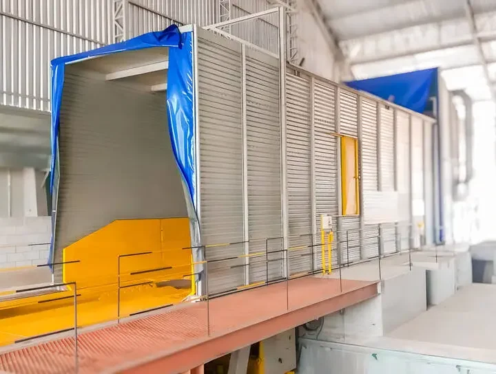 – Cabine de Enclausuramento: Dividida em duas partes, uma parte fixa sobre a moega e outra móvel sobre a plataforma de descarga, interligadas por acoplamento sanfonado.