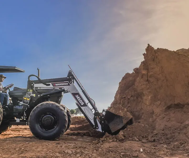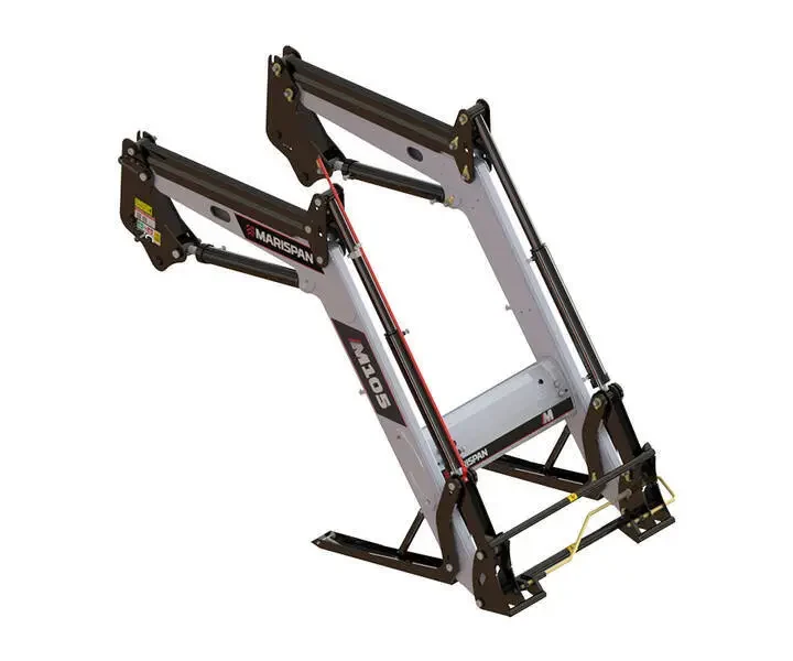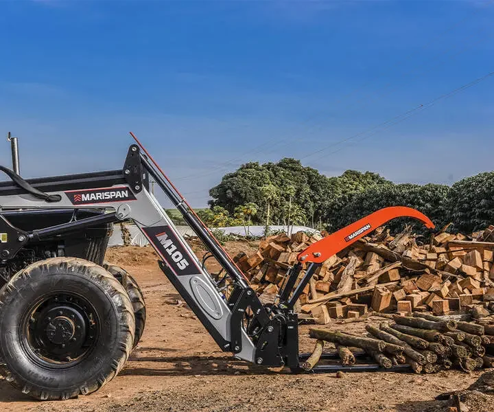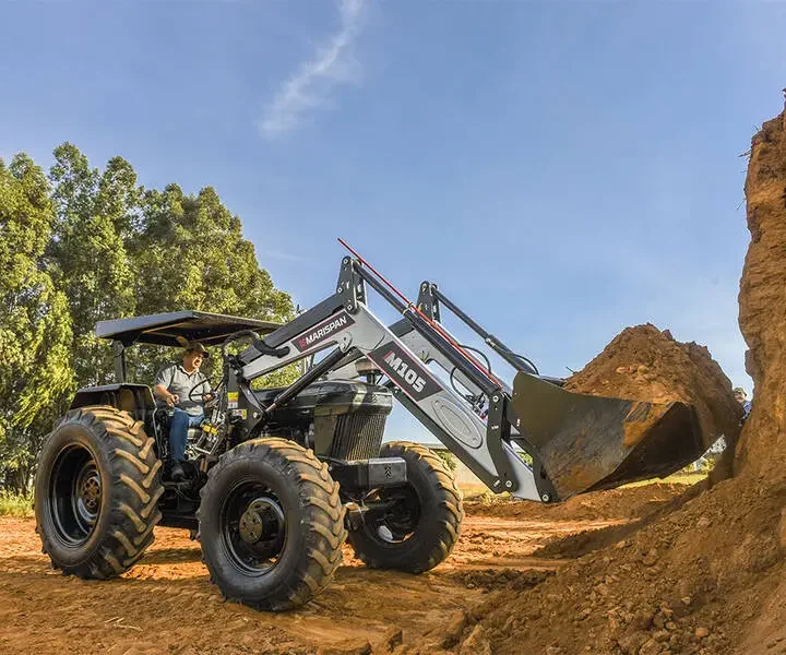 Carregador Frontal autonivelante com acople, desacople do conjunto e troca rápida de acessórios. Compatível com tratores de 100 a 140 CV. Altura máxima de levante 3,70 m e capacidade máxima de carga 1500 kg. Concha dianteira 2,2 m de 550 L.