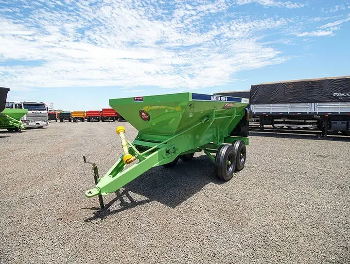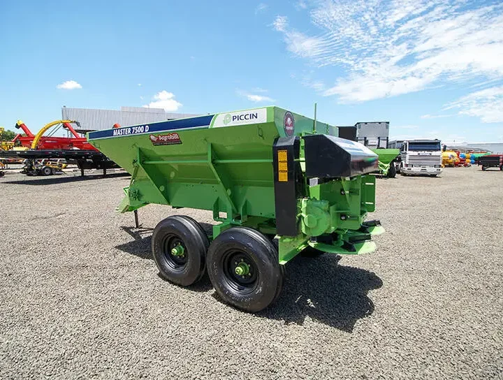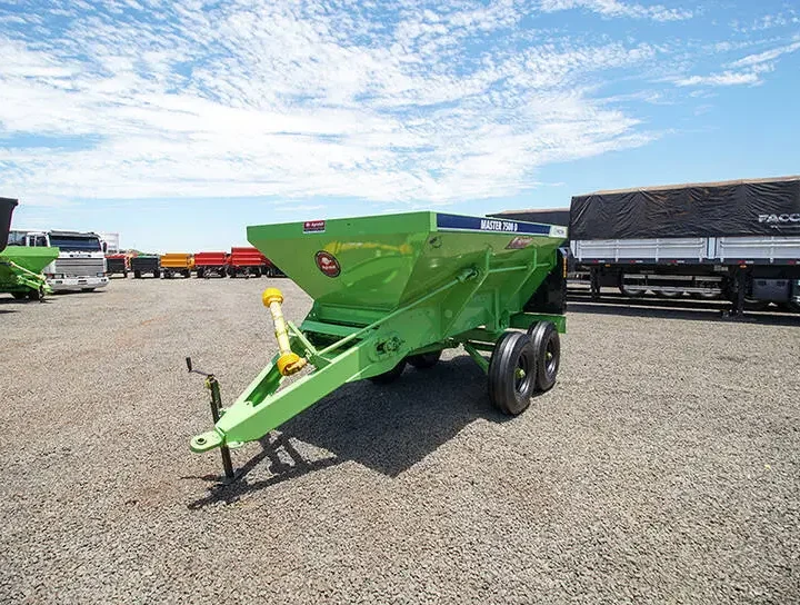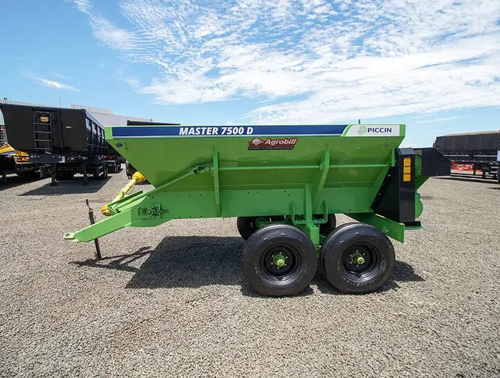 Distribuidor de Calcário e Adubo Orgânico 7500 D Piccin Este produto é vendido com a Esteira Precisa, que garante maior vida útil, além da multifuncionalidade, pois transporta qualquer tipo de material, mesmo que úmido. Também garante maior precisão e homogeneidade na distribuição do material. A esteira transportadora possui três opções de velocidade, que combinadas à regulagem da porta de vazão, oferecem precisão e ampla faixa de regulagem da dosagem. O sistema de carenagem da esteira transportadora, permite que o distribuidor trabalhe tanto como esteira de 80cm (orgânico), como esteira de 40cm (calcário e granulados).