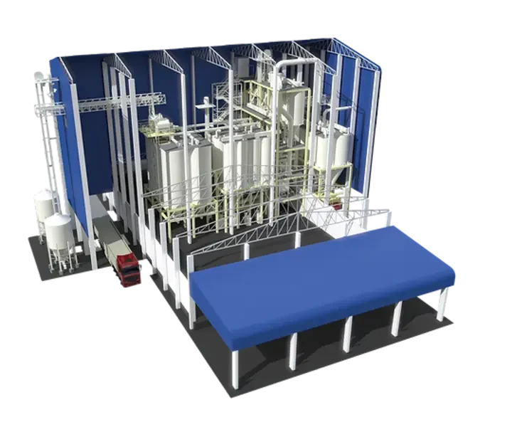 Fábrica de médio porte com capacidades que variam de 15 a 45 ton/h. Com arranjo sofisticado, contempla recepção de matérias primas macros via moega, e o processo tem como característica o peneiramento total deste fluxo de entrada, armazenamento interno de macros, armazenamento externo de milho (normalmente solução com armazenagem padrão de silo graneleiro – fora de escopo), dosagem automática de macros, moagem conjunta, entrada de minerais via descarregador de bag automatizado, premix via moega de adição manual assistida, processo de micro-dosagem automática dos minerais, mistura, peletização parcial ou total, e expedição via ensaque, expedição a granel convencional ou robotizada. Escopo completo com estrutura metálica de apoio aos equipamentos obedecendo todas normas de acessibilidade. Opcionalmente o escopo pode contemplar o prédio geral. Totalmente equipada com equipamentos auto-limpantes, robustos e modernos, formam o que há de melhor em solução para fabricação de ração. Se ainda tem alguma consulta sobre mais detalhes técnicos ou forma de pagamento disponível para esse produto, entre em contato com a gente para que possamos te ajudar. Complete seus dados no formulário de contato ou consulte o número de telefone/whatsapp disponível para algum dos nossos vendedores te brindar todas as informações e consultas sobre este produto.