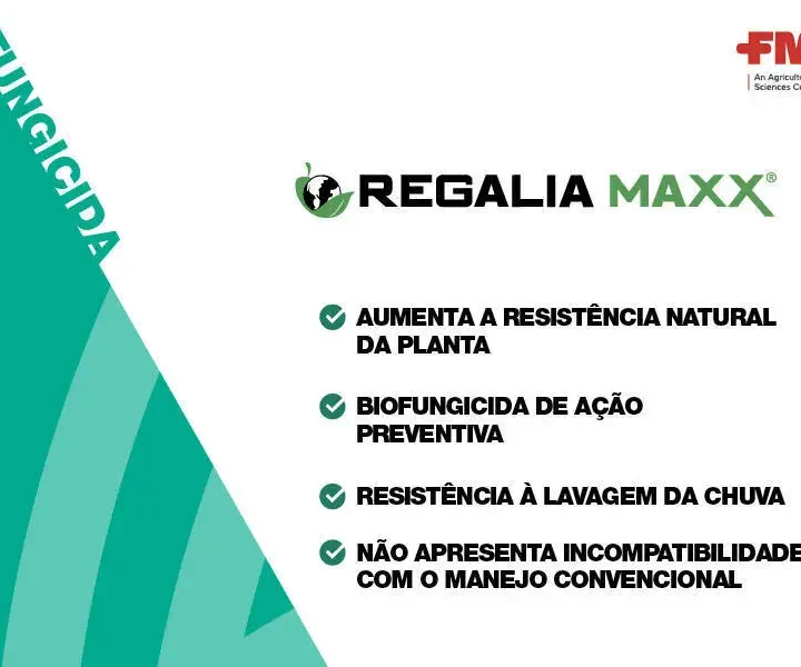 Fungicida REGALIA MAXX para HF FMC Regalia® Maxx é um fungicida bioquímico, cujo princípio ativo, Reynoutria sachalinesis, ocorre naturalmente. Recomenda-se o extrato de Reynoutria sachalinesis para aumentar os mecanismos naturais de defesa das plantas contra certas doenças fúngicas e bacterianas, a fim de aumentar a produtividade e/ou melhorar a qualidade da produção.  Recomendado para uso na cultura de alface, batata, cenoura, feijão, mamão, manga, melancia, melão, pimentão, tomate e uva. Regalia® Maxx deve ser aplicado preventivamente ao aparecimento das doenças para proteger o tecido foliar em crescimento. Regalia® Maxx ativa os sistemas naturais de defesa das plantas, protegendo-as de ataques de patógenos. Quando tratadas com Regalia® Maxx, as plantas produzem e acumulam níveis elevados de proteínas especializadas e outros compostos que inibem doenças fúngicas e bacterianas. Preventivamente, a aplicação foliar do produto fornece proteção de contato, translaminar e sistêmica. Para mais informações consulte a bula deste produto Você precisa de mais alguma informação? Complete seus dados no formulário de contato ou consulte o número de telefone/whatsapp disponível para que algum dos nossos vendedores possa te brindar todas as informações e consultas sobre este produto.
