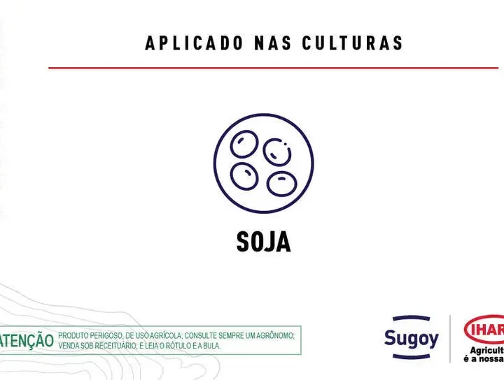 Fungicida SUGOY IHARA Força tripla contra a ferrugem da soja Sugoy é o fungicida premium mais completo do mercado! Sua formulação de alta tecnologia tem protetor agregado e dispensa a necessidade de misturar com outros produtos. Essa ferramenta é efetiva no manejo de resistência, combatendo com performance avassaladora a ferrugem e a antracnose. Especialmente desenvolvido para a cultura da soja, Sugoy ainda traz a sinergia perfeita de 3 mecanismos de ação, com força tripla para proteger a sua lavoura. Conte com essa força de arrepiar para combater as doenças da soja! Ação fungicida: