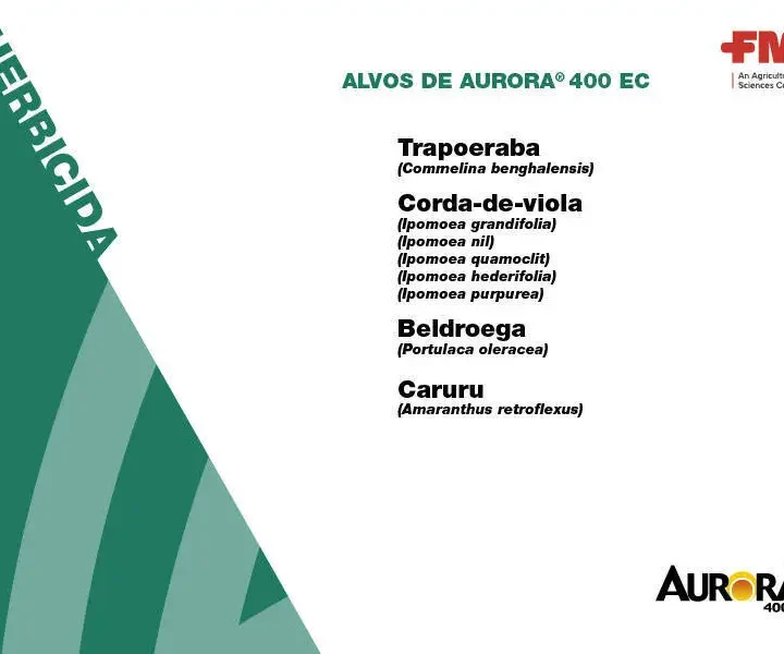 Herbicida AURORA Soja FMC O herbicida Aurora® 400 EC é um herbicida pós-emergente, seletivo condicional de ação não sistêmica, recomendado para o controle de plantas infestantes descritas no quadro abaixo. Trapoeraba (Commelina benghalensis): Aplicação em pósemergência das plantas infestantes e na pré-emergência da cultura. Corda-de-viola (Ipomoea grandifolia): Aplicação em pósemergência das plantas infestantes e no pré-plantio da cultura (dessecação no sistema plantio direto). Trapoeraba (Commelina benghalensis): Aplicação para dessecação de plantas daninhas na pré-colheita da soja. Corda-de-viola (Ipomoea grandifolia): Aplicação para dessecação de plantas daninhas na pré-colheita da soja. Para mais informações consulte a bula deste produto Você precisa de mais alguma informação? Complete seus dados no formulário de contato ou consulte o número de telefone/whatsapp disponível para que algum dos nossos vendedores possa te brindar todas as informações e consultas sobre este produto.