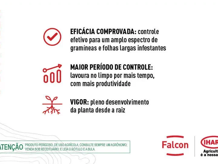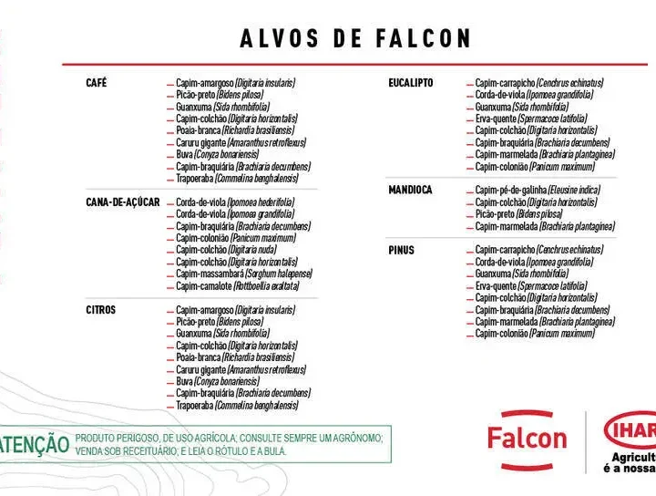 Herbicida FALCON IHARA As daninhas são presas fáceis nas garras do FALCON Falcon é o herbicida para cana, café e citros, entre outras culturas. Ele controla as plantas daninhas de folhas largas e estreitas, como capim-colchão, capim-colonião, capim-braquiária, corda-de-viola, entre outras espécies. Desenvolvido com a revolucionária tecnologia Yamato, Falcon compõe os Herbicidas do Futuro IHARA, oferecendo alta seletividade e longo residual. Graças à ação pré-emergente, o herbicida controla as daninhas resistentes antes mesmo de emergirem nas lavouras. Com essa inovadora solução, sua cultura já começa a se desenvolver no limpo, evitando a matocompetição inicial. Não deixe seu cultivo perder espaço e nutrientes para essas invasoras. Deixe as daninhas nas garras do Falcon! Planta Daninha: