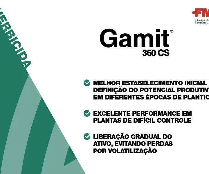 Herbicida GAMIT® 360 CS Arroz FMC O herbicida Gamit® 360 CS é seletivo e sistêmico pré-emergente, recomendado para o controle de plantas infestantes, conforme recomendações abaixo: Para a cultura de Arroz aplicação em pré-emergência das plantas infestantes e da cultura. Aplicar o produto imediatamente após a semeadura da cultura (plante e aplique) em solo livre de torrões através de uma boa gradagem. Antes do plantio, as sementes devem ser tratadas com safener Permit® ou Permit® Star, os quais funcionam como protetor e conferem seletividade ao produto para a cultura. A escolha da dose depende da infestação e do tipo de solo. As maiores doses devem ser utilizadas para o controle de áreas sujeitas a altas infestações e a menor para baixas infestações. Em solo argiloso, utilizar sempre a maior dose e, em solo arenoso, a menor dose. Para mais informações consulte a bula deste produto. Você precisa de mais alguma informação? Complete seus dados no formulário de contato ou consulte o número de telefone/whatsapp disponível para que algum dos nossos vendedores possa te brindar todas as informações e consultas sobre este produto.