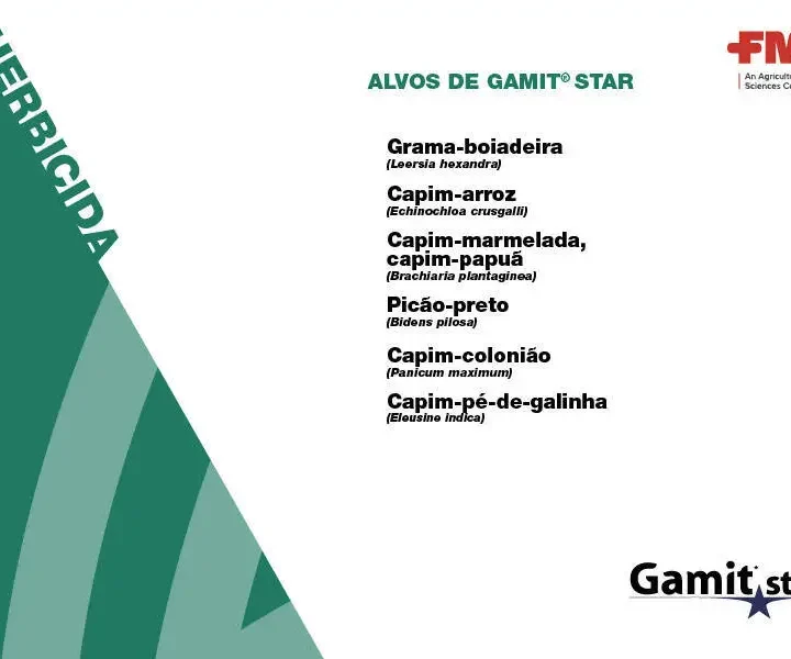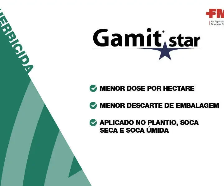 Herbicida GAMIT STAR Cana FMC O herbicida Gamit® Star pertence à classe pré-emergente e pós-emergente seletivo condicional de ação sistêmica, recomendado para o controle de plantas infestantes conforme recomendações da bula. O herbicida Gamit® Star pode ser aplicado por via terrestre, através de pulverizadores manuais e tratorizados, e por via aérea (arroz irrigado), conforme recomendações para cada cultura. Além das recomendações acima para as culturas indicadas, levar em consideração que o solo deve estar livre de torrões, previamente eliminados por um bom preparo do solo pela gradagem. O produto precisa de uma quantidade mínima de umidade no solo para sua ativação. Na ausência desta, deve-se aguardar uma chuva leve (maior que 10mm). Neste caso, se houver plantas infestantes já germinadas, as mesmas devem ser eliminadas através de um cultivo superficial (tratorizado ou manual) nas entrelinhas, evitando-se o movimento intenso do solo para manter o produto na camada superficial. Utilize sempre tecnologias de aplicação que ofereçam boa cobertura do alvo desejado. Siga sempre as boas práticas para aplicação e as recomendações do fabricante do equipamento. Consulte sempre o Engenheiro Agrônomo responsável. Para mais informações consulte a bula deste produto Você precisa de mais alguma informação? Complete seus dados no formulário de contato ou consulte o número de telefone/whatsapp disponível para que algum dos nossos vendedores possa te brindar todas as informações e consultas sobre este produto.
