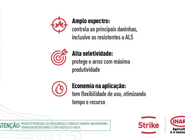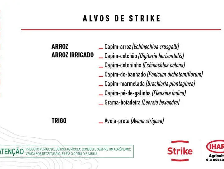 Herbicida STRIKE IHARA Acerte a mira na sua produtividade e derrube as daninhas com STRIKE! STRIKE, novo herbicida pós-emergente da IHARA altamente seletivo ao arroz, com amplo espectro de ação em gramíneas resistentes e de difícil controle. O novo herbicida da IHARA tem alta seletividade para o arroz. Ele combate com eficácia capim-arroz, capim-do-banhado, capim-pé-de-galinha, capim-papuã, capim-colchão e mais! Com amplo espectro de ação em gramíneas resistentes e alta velocidade de ação, é a ferramenta que você precisava para ter um manejo eficaz das daninhas tolerantes a ALS. Planta Daninha: