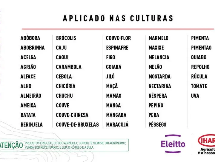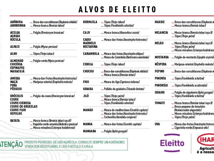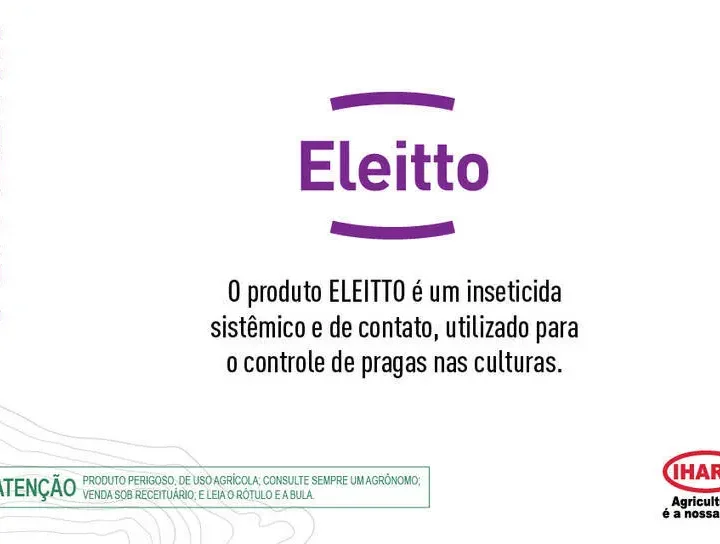 Inseticida ELEITTO IHARA Não eleja pragas. Eleitto é um exclusivo inseticida para hortifruticultura. Ele possui registro para mais de 30 cultivos, como cebola, maçã, uva, abóbora e mais! O inseticida da IHARA possui amplo espectro, controlando pragas que ameaçam a produtividade e qualidade das frutas e hortaliças. Entre elas, a mosca-das-frutas, a mosca-branca, o pulgão, a mosca-minadora e outras pragas. Além disso, Eleitto confere ação de choque, eliminando o inseto rapidamente, e longo residual, mantendo sua proteção por mais tempo. Eleitto pode ser aplicado em qualquer fase da cultura, até mesmo próximo da colheita. Com isso, proporciona aos seus produtos mais tempo de exposição, com vigor e qualidade. Eleja o melhor para HF! Classe Toxicológica:
