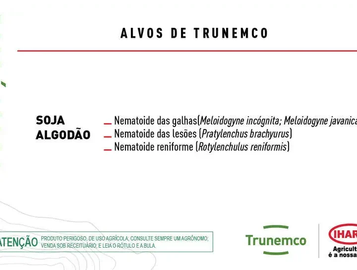 Nematicida Biológico TRUNEMCO IHARA Trunemco uma colônia de proteção já na semente. Trunemco é o bionematicida que coloniza a raiz da planta e repele os nematoides, recomendado tanto para Tratamento de Sementes Industrial, quanto On Farm. Esta inovação da IHARA oferece o maior espectro de ação do mercado, sendo eficaz contra o nematoide-das-galhas, o nematoide-das-lesões, o nematoide reniforme e mais. Biológico à base de Bacillus amyloliquefaciens, bactéria para controle e gerenciamento de nematoides, protege as sementes de forma sustentável e promove mais produtividade para sua lavoura. A solução possui registro para soja, milho, algodão e feijão. Conte com a proteção biológica de Trunemco e não deixe os nematoides ocuparem o espaço da sua rentabilidade! Classe Toxicológica: