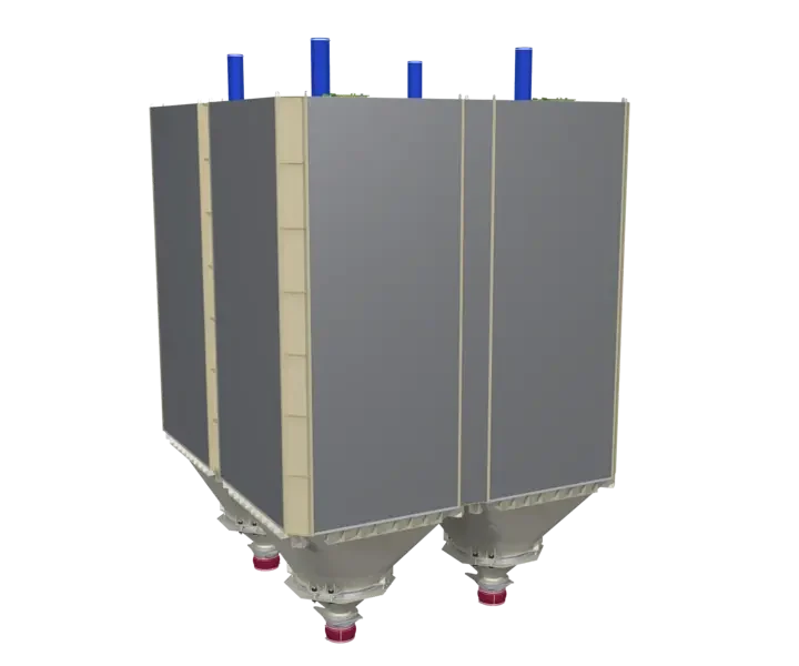 Silo de Armazenagem Prismático – Krabbe – GK-SPL SILO DE ARMAZENAGEM prismático de Construção: SAE 1020. ou AISI 304 (INOX). Com grande versatilidade para arranjo de painéis atendem grande gama de capacidades, e contribuem para uma maior otimização da fábrica nas funções de recebimento de matéria prima, dosagem, produto acabado, etc…. Os painéis são estruturados e juntos formam um corpo único dividido em células com eliminação de cantos internos para prover escoamento ideal.