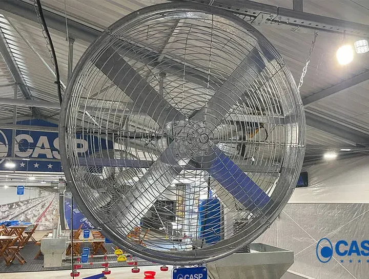 O ventilador Tufão 300 da CASP é ideal para galpões de frango de corte, matriz, postura, suínos e gado de leite. Ele proporciona um fluxo máximo de ar, eliminando o excesso de amônia e umidade resultante da respiração dos animais e dos dejetos. Essa ventilação eficaz mantém a cama seca, prevenindo a proliferação de fungos e bactérias.